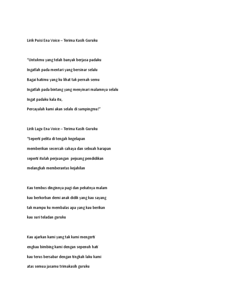 Lagu ini kemudian dipopulerkan oleh AT Mahmud. Ya Tuhan tiap jam di suka-dukaku jikalau Tuhan jauh percuma hidupku. Lirik Lagu Ena Voice Terima Kasih Guruku.